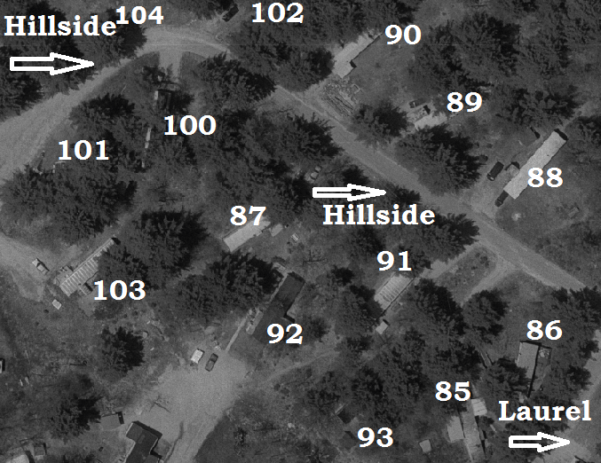 We will be using the original Lot #s from the Park: 1-115 and starting where the lots are labeled on the map above (Hillside Drive). The 3 dots after a name (i.e. the Lagor family) show that the same people lived at that lot during the years we are looking at.