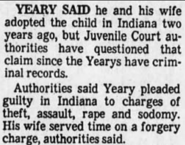 There are so many odd stories out there. Like this one from 1983. A 28 year old woman named Elizabeth Diane Hamlin, from Huntsville TX, abandoned her four children, Trevor, 6, Sissy, 5, Kevin, 3, and Jason, 2, at a McDonald's restaurant in Memphis, TN. She was arrested in Chattanooga after a Salvation Army clerk recognized her from news accounts about the abandoned children. At first, Elizabeth said she was abducted by her traveling companions, Indianapolis couple Robert Lee Yeary, 42, and his wife, Carolyn Sue Yeary, 29. However, soon Elizabeth, the Yearys, and an "unidentified male" are charged with aggravated rape involving two of the children and the Yearys are also charged with raping their 7 year old adopted daughter while working at Tellico River Ministries Camp. Police also found "97 sexually explicit photographs of the Yearys, an unidentified woman, and what appeared to be a man dressed as a woman" in Mrs. Yeary's purse.